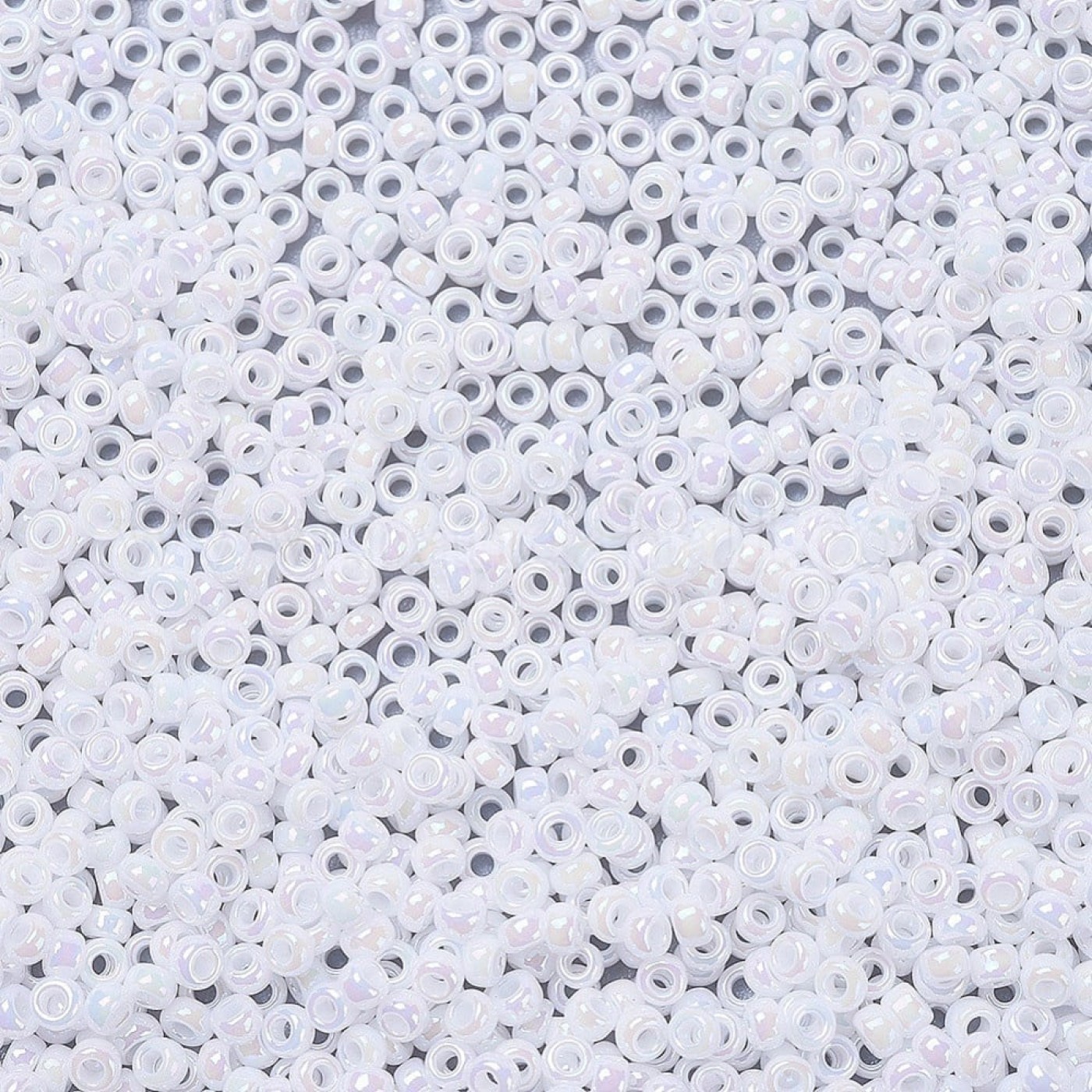 Круглый бисер MIYUKI белого цвета (#471) имеет покрытие "Opaque Rainbow"