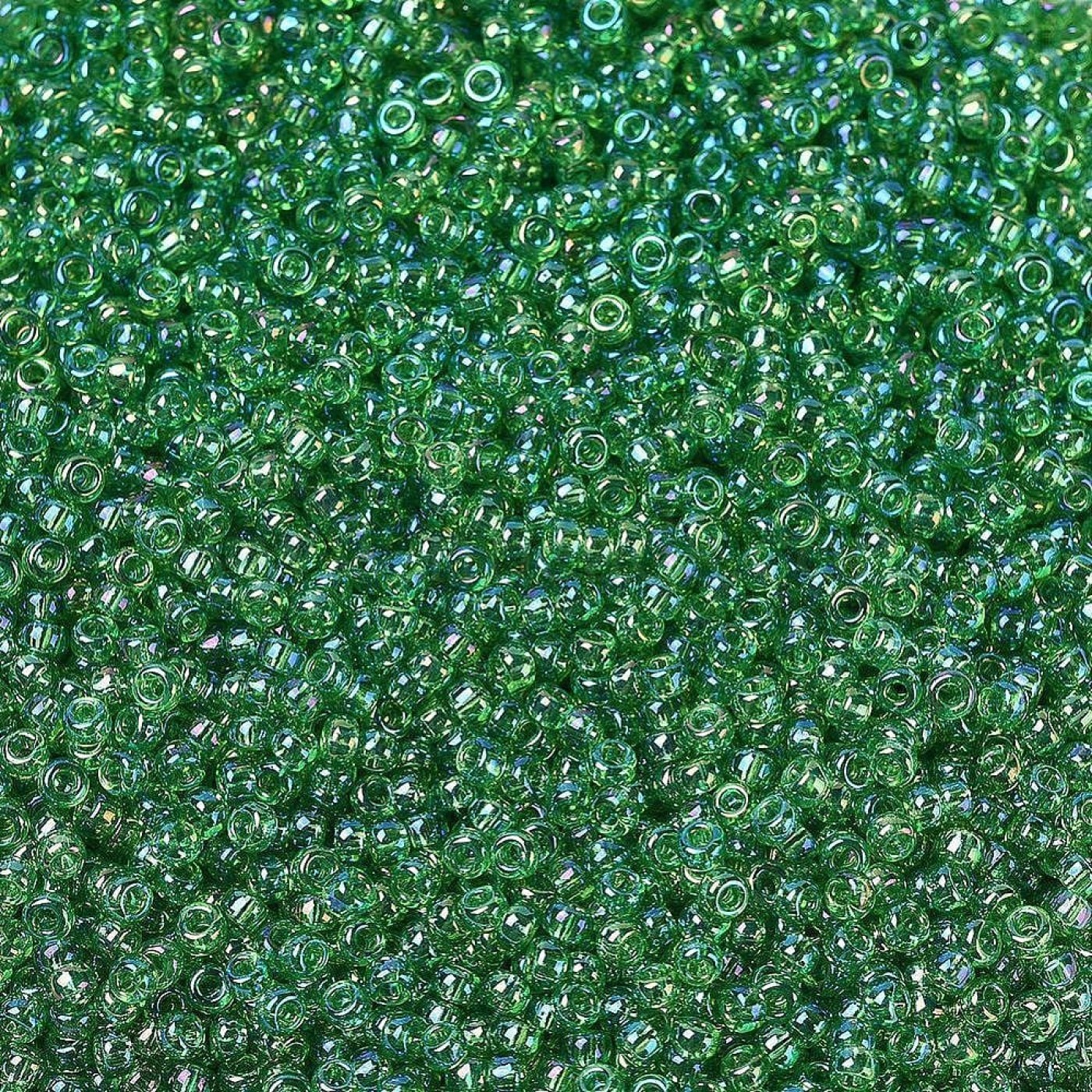 Бисер MIYUKI круглый 15/0 ROUND ROCAILLE TRANSPARENT GREEN AB, #179 — изысканный японский бисер с прозрачной стеклянной основой и радужным переливом покрытия AB (Aurora Borealis). Этот эффект придаёт бусинам мягкое сияние — зелёный цвет кажется более глубоким и живым, особенно при естественном или направленном свете.
