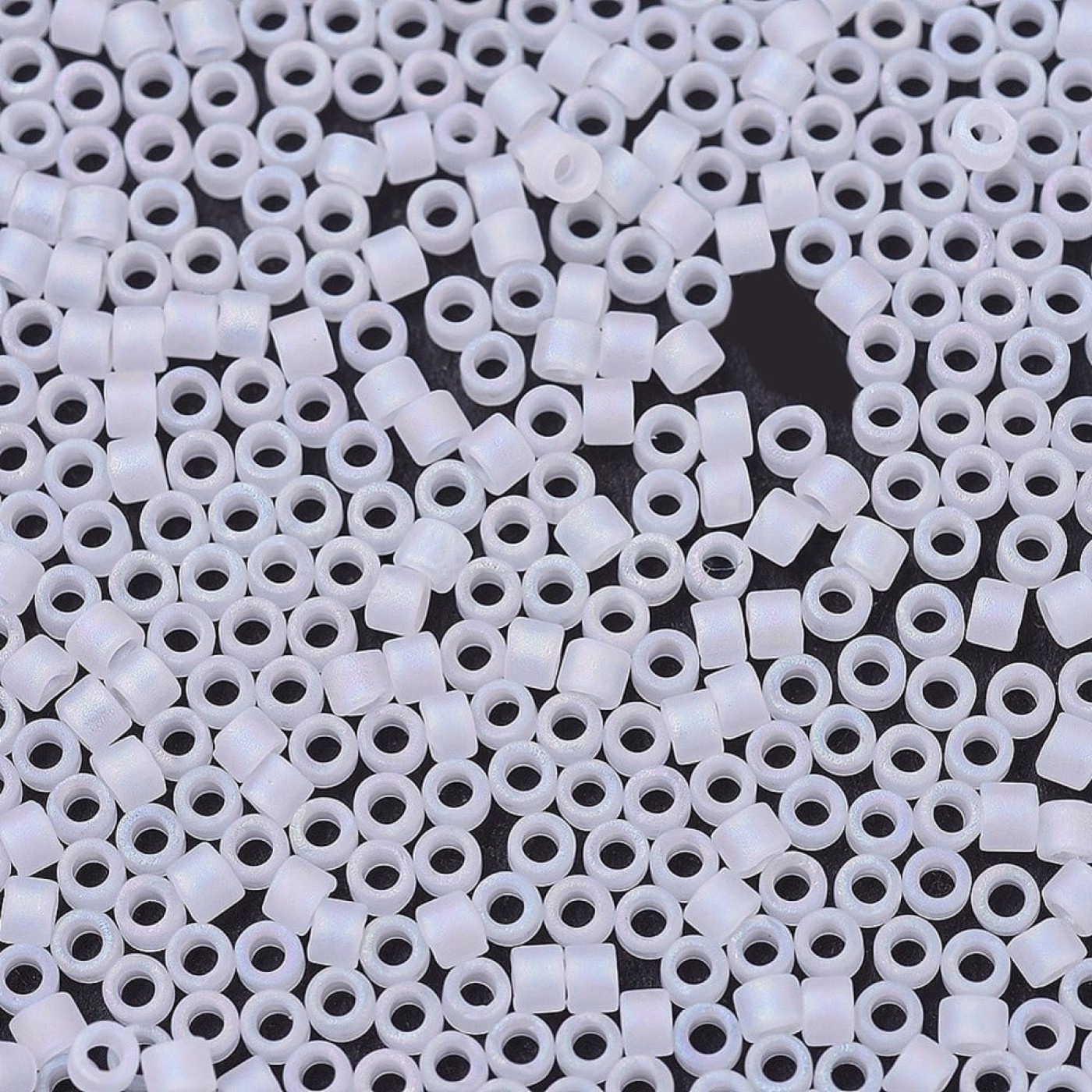 Miyuki Delica DB851 Matte Crystal AB — японский цилиндрический бисер премиум-качества с матовой (матте) поверхностью и радужным покрытием Aurora Borealis (AB), которое придаёт лёгкий перелив под разным углом освещения. Такой эффект делает бисер визуально интересным и богатым, особенно в сочетаниях с другими текстурами.