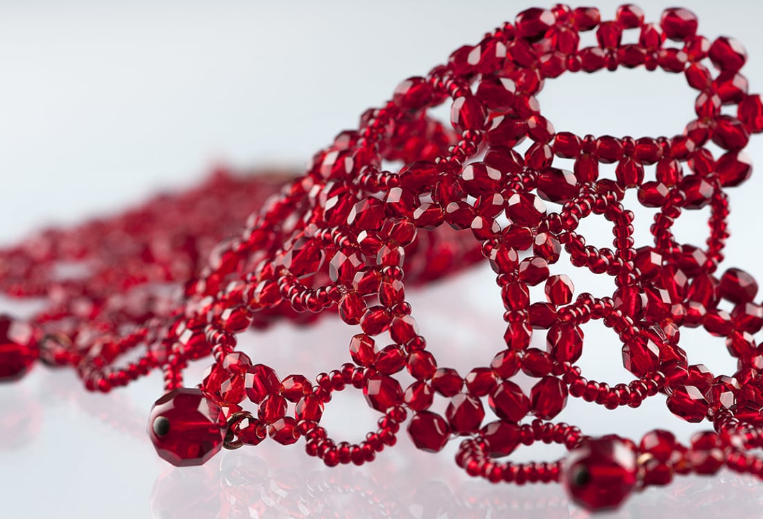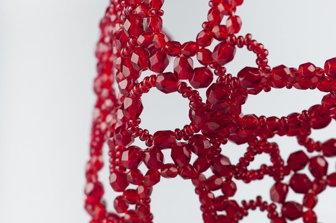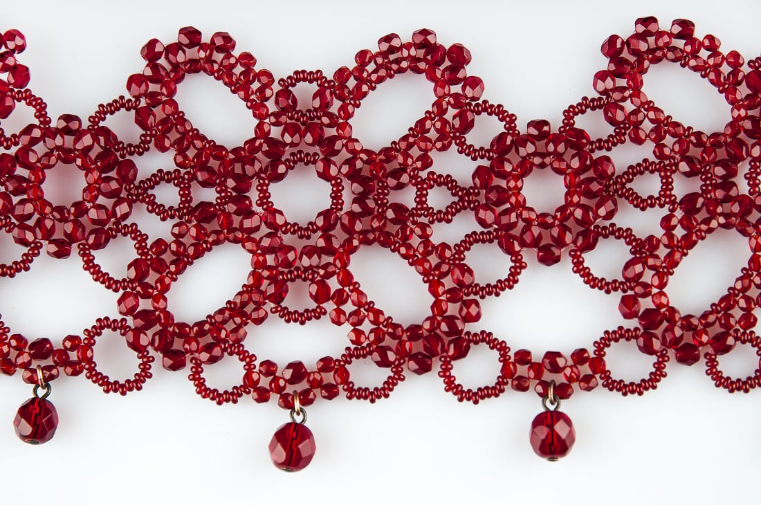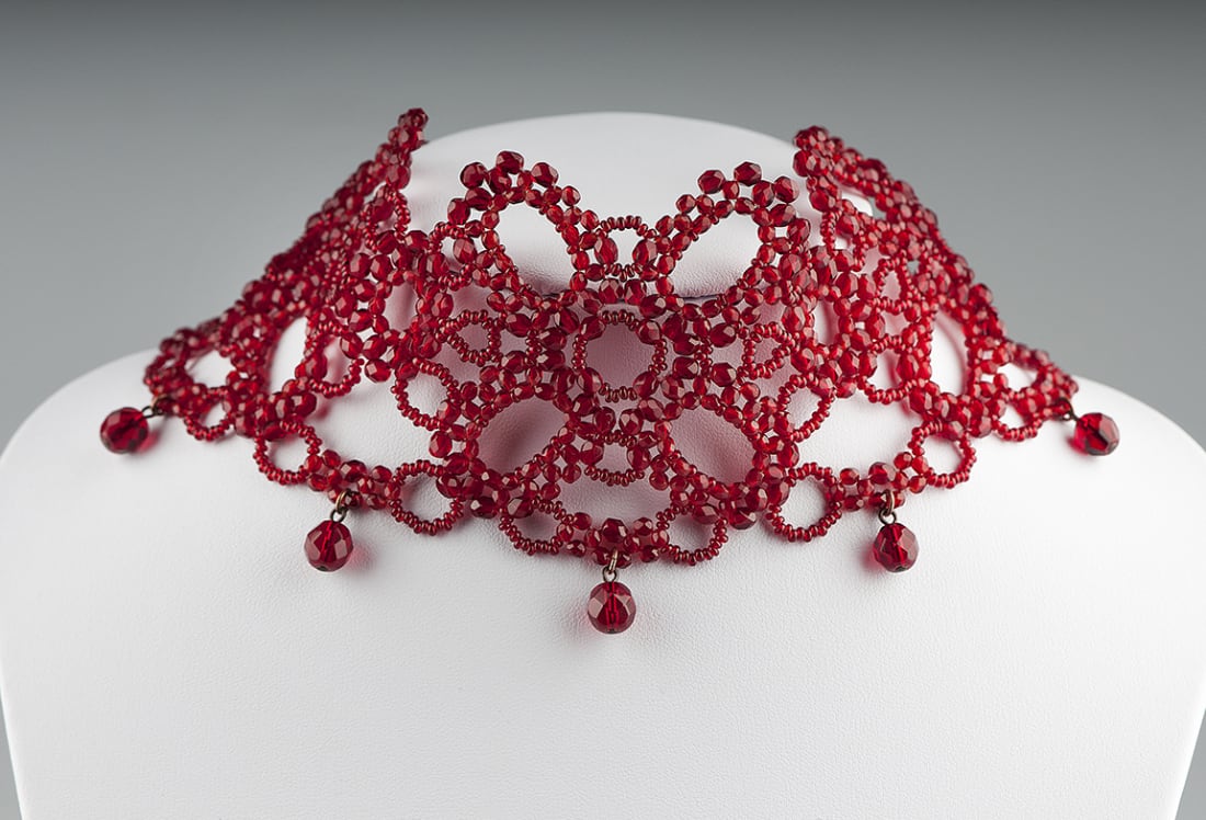 Ожерелье состоит из отдельных частей, сшитых швом «прямоугольное плетение», овалов и кругов из нарезанных бусин. Они затем соединяются рокайлями, формируя либо простой круг, либо снова по принципу шва «прямоугольное плетение».