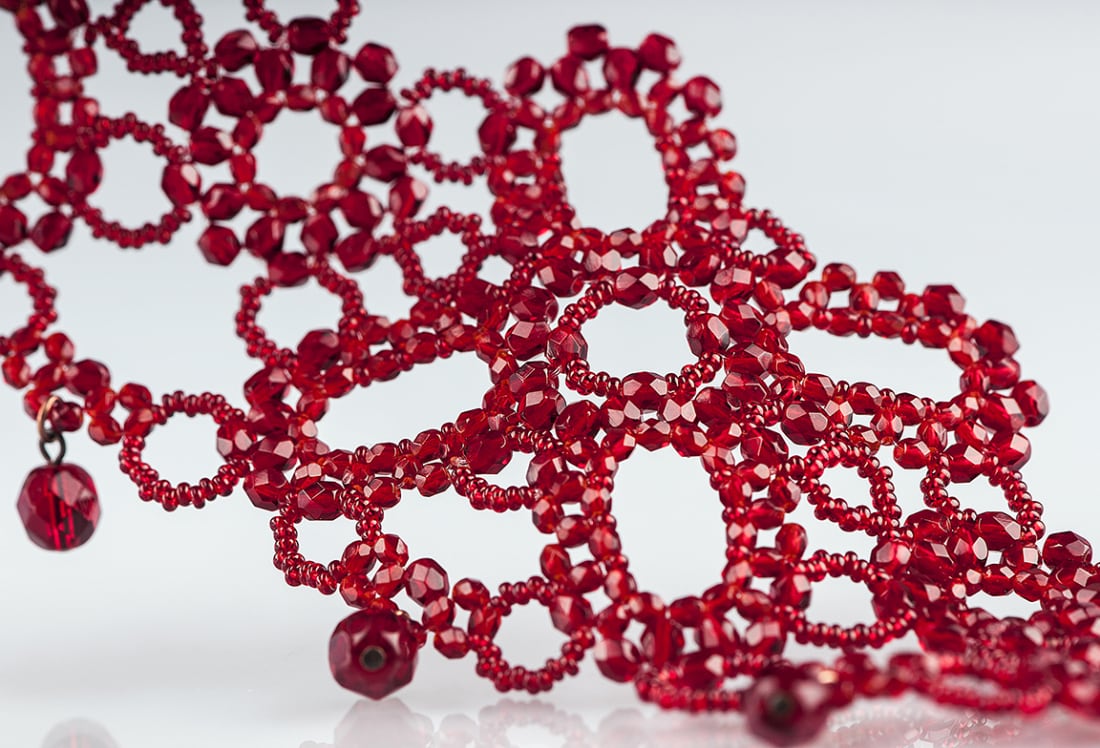 В проекте Luxurious Valentine вы создадите сложное вечернее ожерелье – символ роскоши и любви — всё говорит о страсти к деталям и умении делать красоту своими руками. Здесь используются 3 размера бусин Fire Polished (3 мм, 4 мм и 8 мм) и обрамление из бисера 10/0, оригинальное соединение овалов и колец, всё сплетено и аккуратно усилено декоративными “четырёхлистниками” и подвесками.