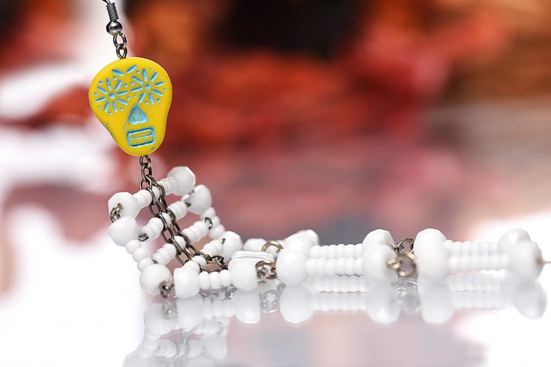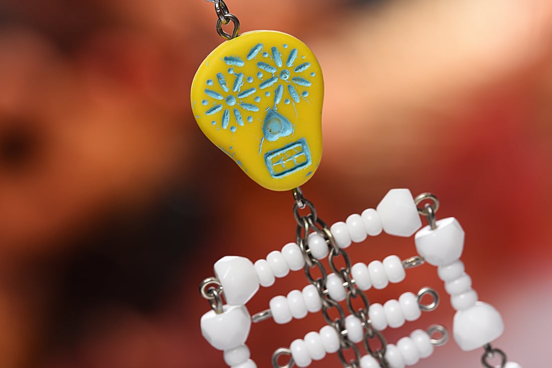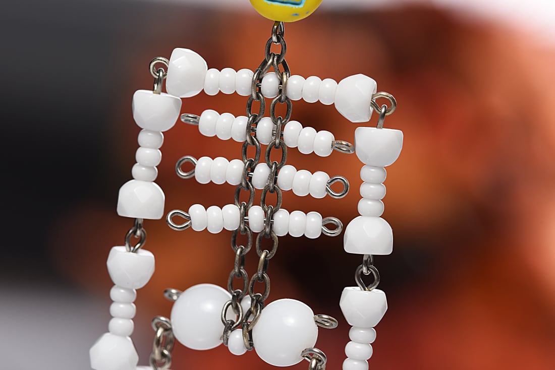 В работе используется чешский бисер Rocailles, металлические швензы и ювелирная проволока, а конструкция состоит из подвижных частей — головы, позвоночника и конечностей, соединённых колечками. Благодаря точной схеме и простым шагам серьги-скелеты подойдут даже тем, кто только начинает осваивать бисероплетение.