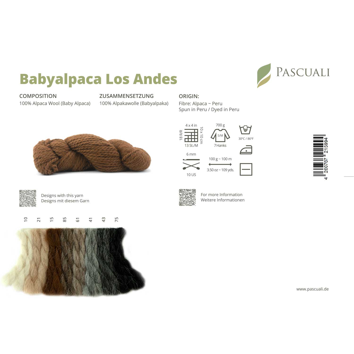 Как следует из названия, пряжа Babyalpaca Los Andes на 100% состоит из волокон беби альпаки из перуанских Анд. Эти волокна, полученные после первой стрижки, ещё мягче, чем волокна взрослых животных. Мы предлагаем вам эту замечательную пряжу только неокрашенной. Благодаря разнообразию окраски альпак, цветовая палитра Babyalpaca Los Andes представлена восемью оттенками: от натурального белого до коричневого и антрацитового.