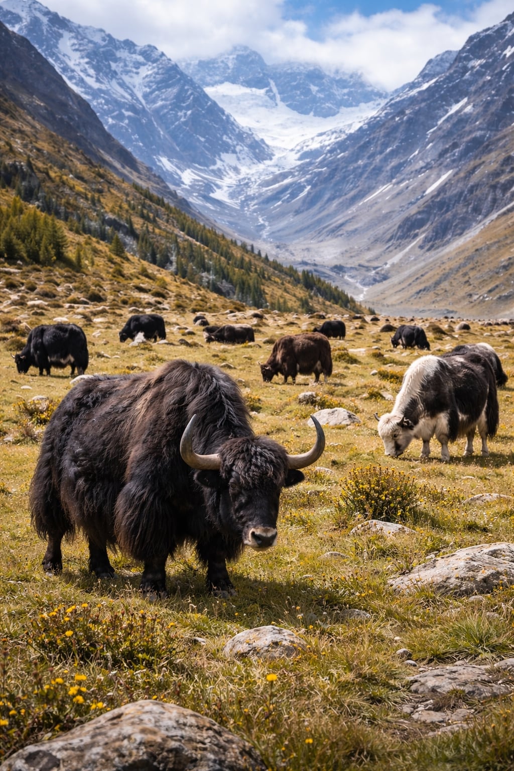 Як — массивное, мохнатое животное, родственник бизона, с длинной шерстью и густым подшерстком. Их называют «гудящими быками» из-за характерных звуков. Самцы могут достигать высоты более 1 метра в холке.
